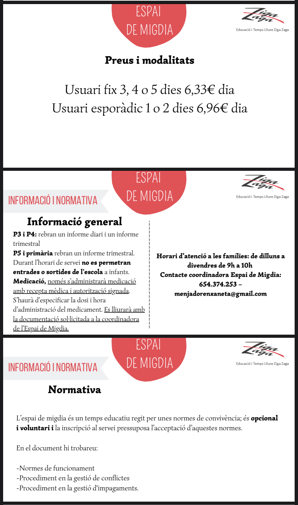 INFORMACIÓ SOBRE EL FUNCIONAMIENT DE L’ESPAI DEL MENJADOR ESCOLAR 13 13+02:00 octubre 13+02:00 2021Generalampaenxaneta Bones Famílies, Us enviem informació molt important, sobre el bon funcionament de l’espai de mig dia, al menjador de la nostra escola. Comparteix això: Feu clic per compartir al Facebook (S'obre en una nova finestra) Facebook Feu clic per compartir a X (S'obre en una nova finestra) X Feu clic per enviar un enllaç per correu electrònic a un amic (S'obre en una nova finestra) Correu electrònic Feu clic per imprimir (S'obre en una nova finestra) Imprimeix