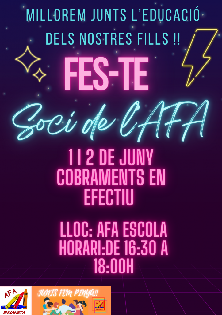 Aquest curs la venda de llibres serà pel mes de juliol/agost degut a això comença abans la inscripció de socis de l’AFA ENXANETA. Començarà al mes de juny.