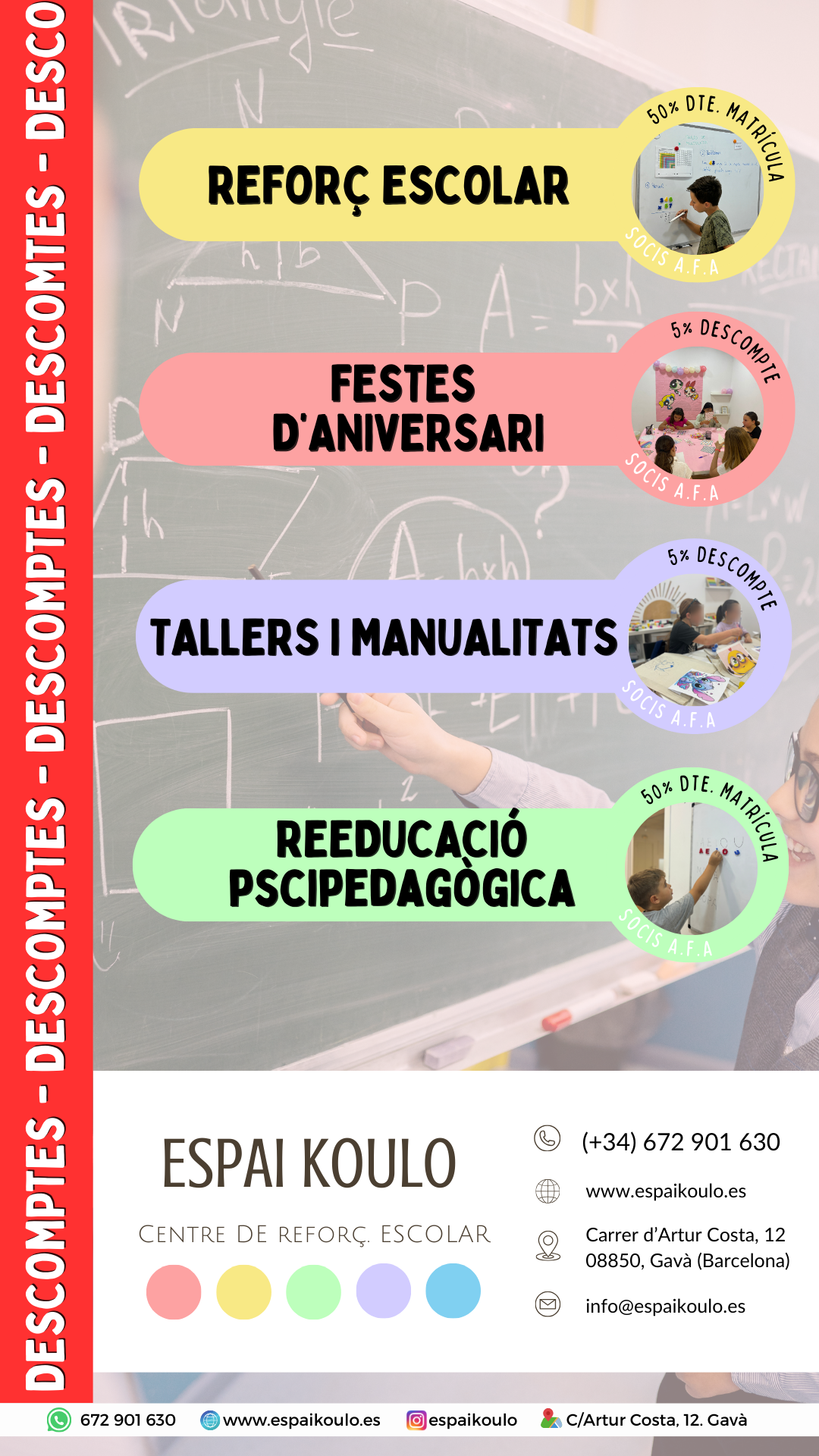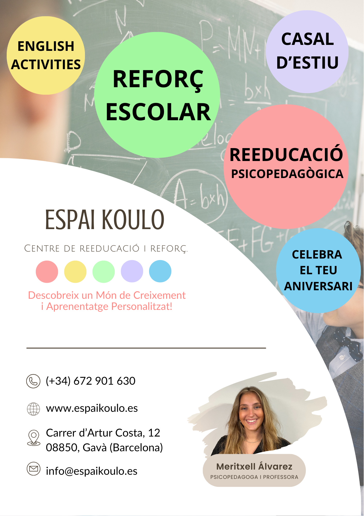 1. ESPAI KOULO: Servicios de reeducación psicopedagógica, refuerzo escolar, talleres educativos y temáticos, cumpleaños, english activities, conferencias educativas, summer school.